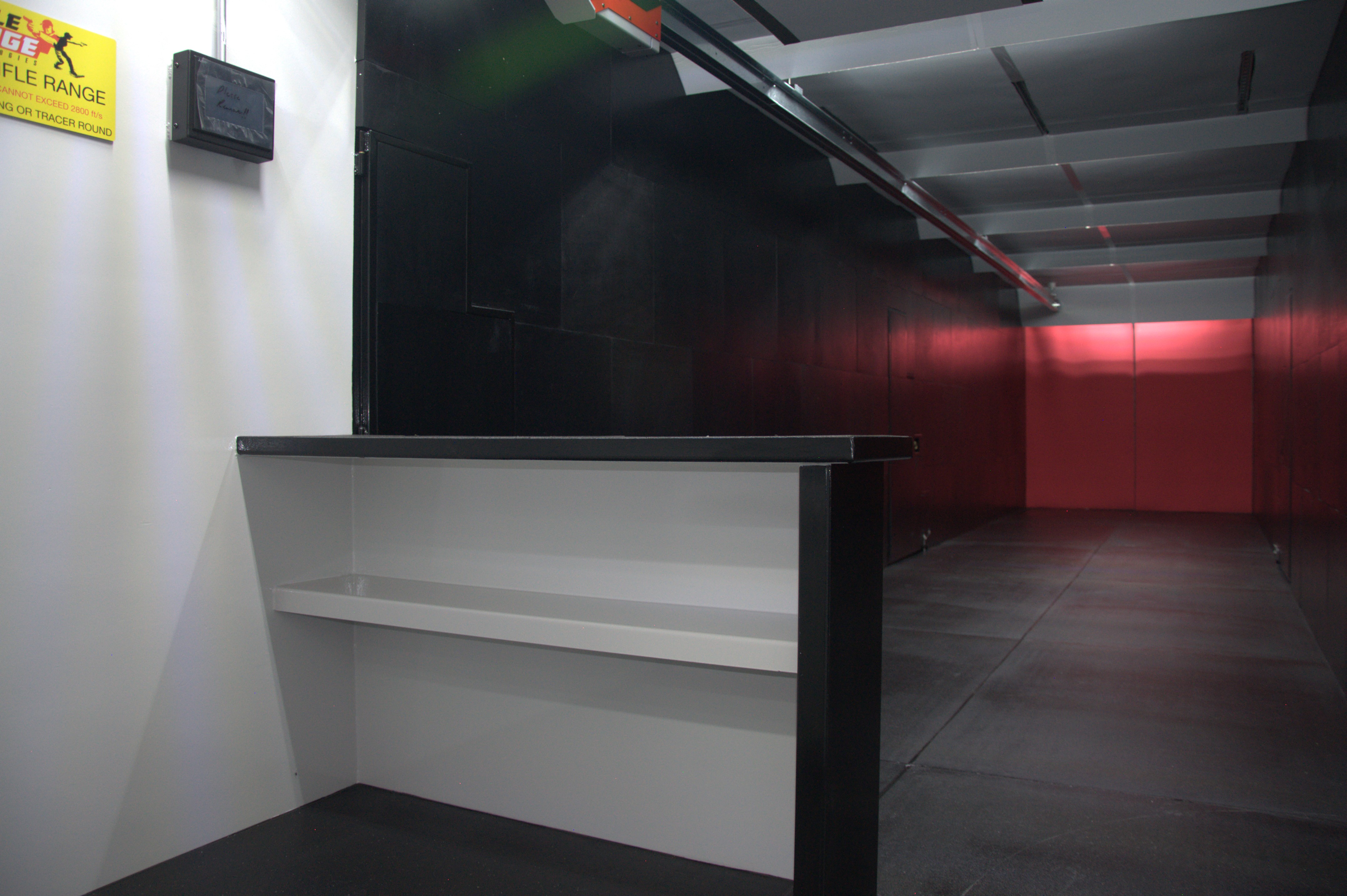 This unit features a 1–10 yard Caliber hard rail target retrieval system, with one lane extended to support 15-yard shooting, allowing for both close-quarters drills and extended-distance training. The range is equipped with a rubber block bullet trap and rubber wall treatment, providing enhanced durability, ricochet protection, and simplified maintenance under high-use conditions.